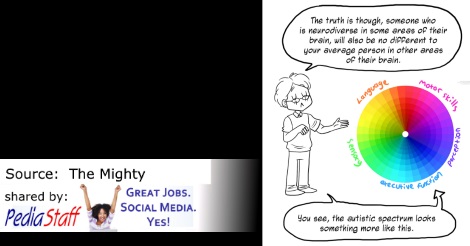 Rebecca Burgess sees a problem with the way many people perceive the autism spectrum. Her resolution? The comic below. The Tumblr user debuted “Understanding the Spectrum” (below), which gets rid of the linear autism spectrum image (i.e. you’re either “not autistic, “very autistic” or somewhere in between) and replaces it with a round spectrum full of several traits or ways the brain processes information.