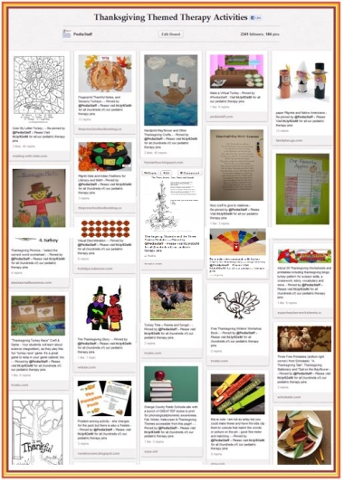 Please enjoy our compilation (growing by the day) of great Thanksgiving Themed Therapy Activities Pinboard on Pinterest. At this writing there are over 300 items!